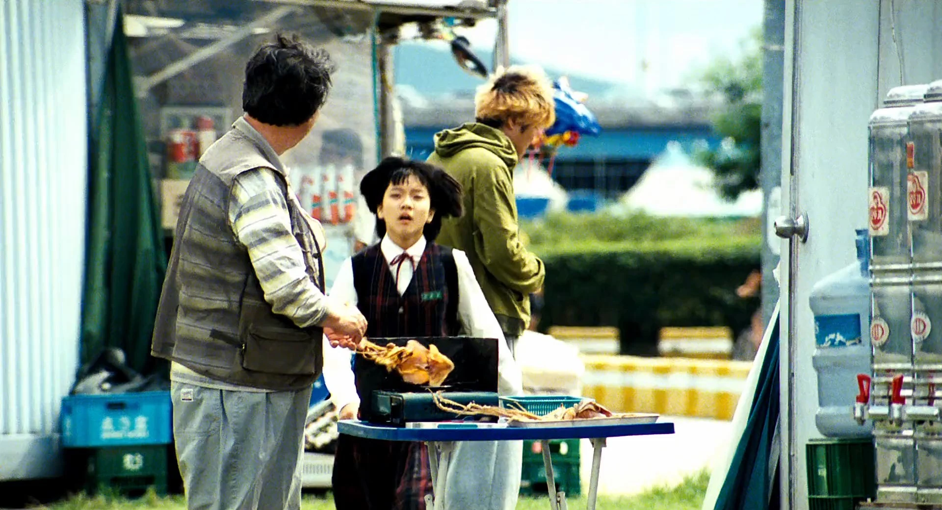 Cast: Song Kang-ho as Park Gang-du, Byun Hee-bong as Park Hie-bong, Park Hae-il as Park Nam-il, Bae Doona as Park Nam-joo, Ko A-sung as Park Hyun-seo, Oh Dal-su as The Monster (voice), Lee Jae-eung as Se-jin, Lee Dong-ho as Se-joo, Yoon Je-moon as Homeless Man, Yim Pil-sung as Fat Guevara, Kim Roi-ha as Yellow Suit at Funeral, Koh Soo-hee as Hostage nurse, Kim Hak-sun as Civilian Military Kim, Scott Wilson as Douglas, Brian Rhee as Young Korean Doctor, Paul Lazar as American Doctor, David Anselmo as Donald, Baek Do-bin as Fumigation Truck Skinny Man, Martin Lord Cayce as U.S. Senator (uncredited), Choi Dae-sung as Man from Duck Boat (uncredited), Choi Doo-yeong as Man on Blind Date (uncredited), Choi Jae-sup as Detective Agency Subordinate 1 (uncredited), Jung Seo-yoon as Woman with Long Hair (uncredited), Philip Hersh as Additional Voices (voice) (uncredited), Jeong In-gi as Isolation Ward Doctor (uncredited), Jeong Hyeong-Ho as 4th Mat 3 (uncredited), Ji Ha-geon as Camera Phone Man (uncredited), Jung Kang-hee as Mr. Yoon's Employee (uncredited), Kim Bi-bi as Isolation Ward Nurse 1 (uncredited), Kim Choo-wol as Woman crying (uncredited), Kim Da-yeon as 5th Mat Woman (uncredited), Kim Hyo-sun as Quarantine Hospital Nurse 2 (uncredited), Kim Jin-seon as Woman from Couple (uncredited), Kim Nan-hee as Woman from Duck Boat (uncredited), Kim Sang-jo as Old Security Guard (uncredited), Kwon Bang-hyeon as Bride-to-be (uncredited), Kwon Byung-gil as Doctor from Isolation Ward 1 (uncredited), Kwon Hyeok-Pung as Fisherman 1 (uncredited), Lee Dong-yong as 4th Mat 2 (uncredited), Lee Eung-jae as Man from Couple (uncredited), Lee Hoon-jin as Fat Man (uncredited), Lee Jong-yoon as 4th Mat 1 (uncredited), Lee Seung-jin as Girl's Father (uncredited), Min Kyung-jin as Altar Security (uncredited), Moon Hee-ra as Camera Phone Woman (uncredited), Clinton Morgan as Agent Yellow (uncredited), Park Jeong-gi as Fumigation Truck Dyed-hir Man (uncredited), Park Kyeong-mok as Groom-to-be (uncredited), Park No-shik as Inquiry Officer, Ra Mi-ran as Woman Stomping Her Feet (uncredited), Seo Ha-neul as Exchanged Girl (uncredited), Shin Seung-ri as Donald's Girlfriend (uncredited), Shin Hyun-jong as Mr. Yoon's Friend (uncredited), Son Young-soon as Grandmother from Bus (uncredited), Son Jin-ho as Doctor from Isolation Ward 2, Song Kyeong-ha as Woman on Blind Date (uncredited), Yoo Seung-mok as Taxi Driver, Yoo Yeon-soo as District officer Mr. Jo (uncredited), Seo Young-ju as Protester, Ko Chang-seok as Nurse, Park Jin-woo as Isolation Ward Constable (uncredited)